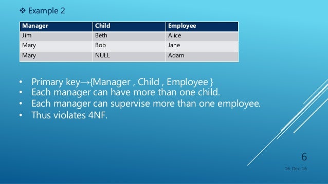 It cannot be further non-loss decomposed5NF is of little practical use to the database designer but it is of interest from a theoretical point of view and a discussion of it is included here to complete the picture of the further normal forms. FIFTH NORMAL FORM5NF 16-Dec-16 8 A table is in the 5NF if its in 4NF and if for all join dependency of 𝑅1 𝑅2 𝑅3 𝑅 𝑚 in R every Ri is a super key for R. Fourth Normal Form4NF Tables cannot have multi-valued dependencies on a Primary Key.