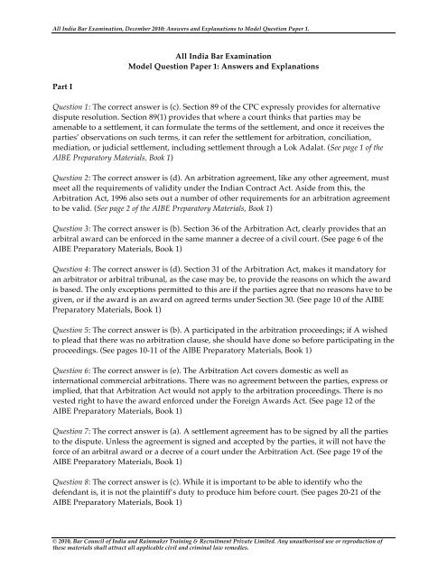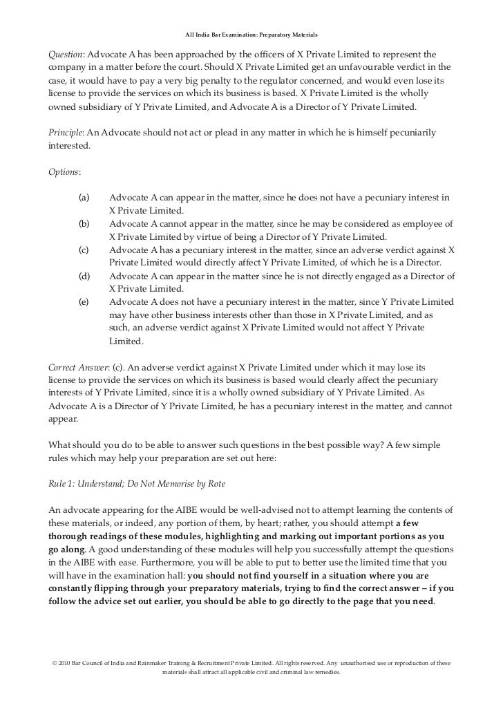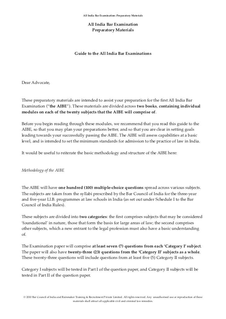 Aibe preparatory materials book 1. 3 hours may seem like a lot of time but its just 15 minutes for each question. Following is a list of suggested AIBE books and relevant study material All India Bar Examination 2010 Preparatory Materials Book 1 All India Bar Examination 2010 Preparatory Material. Preparatory Materials All India Bar Examination Preparatory Materials Guide to the All India Bar Examinations Dear Advocate These preparatory materials are intended to assist your preparation for the first All India Bar Examination the AIBE.